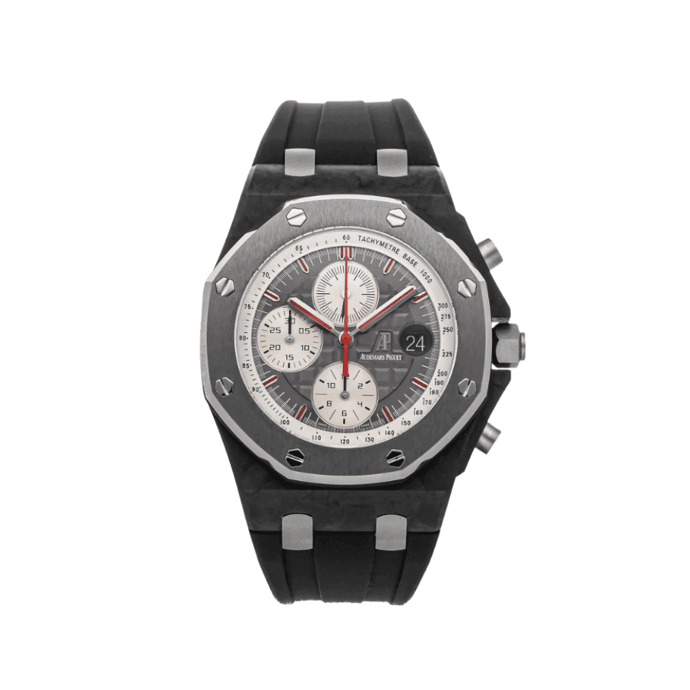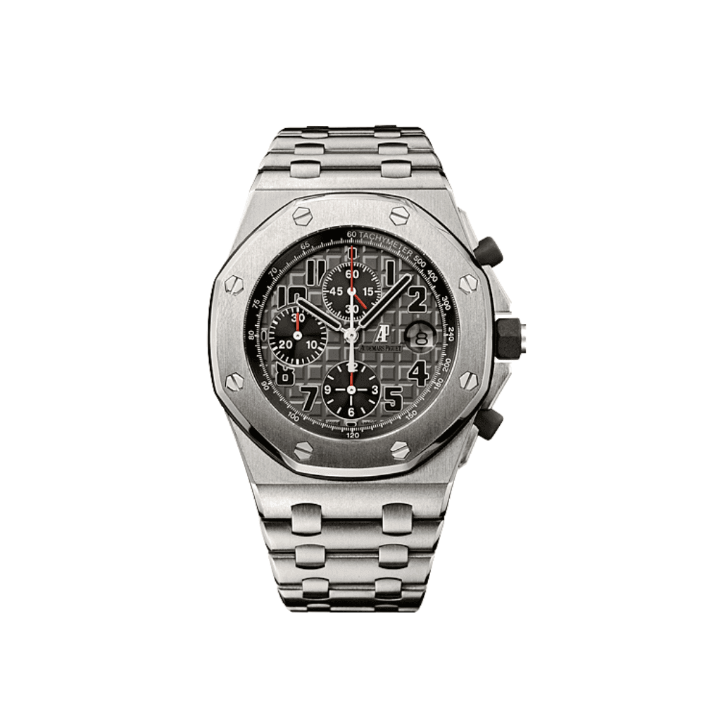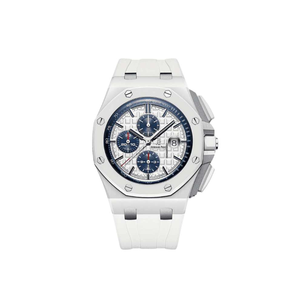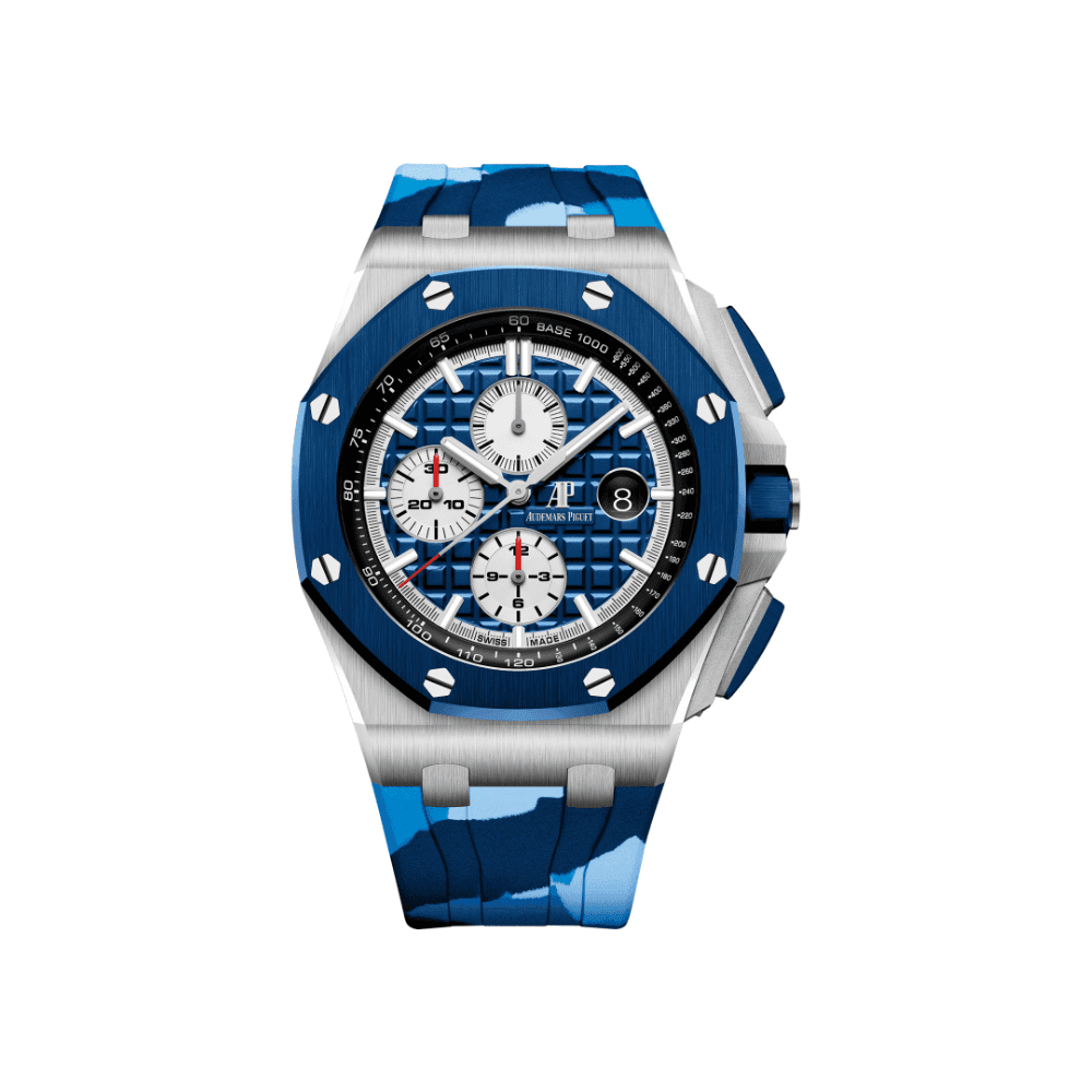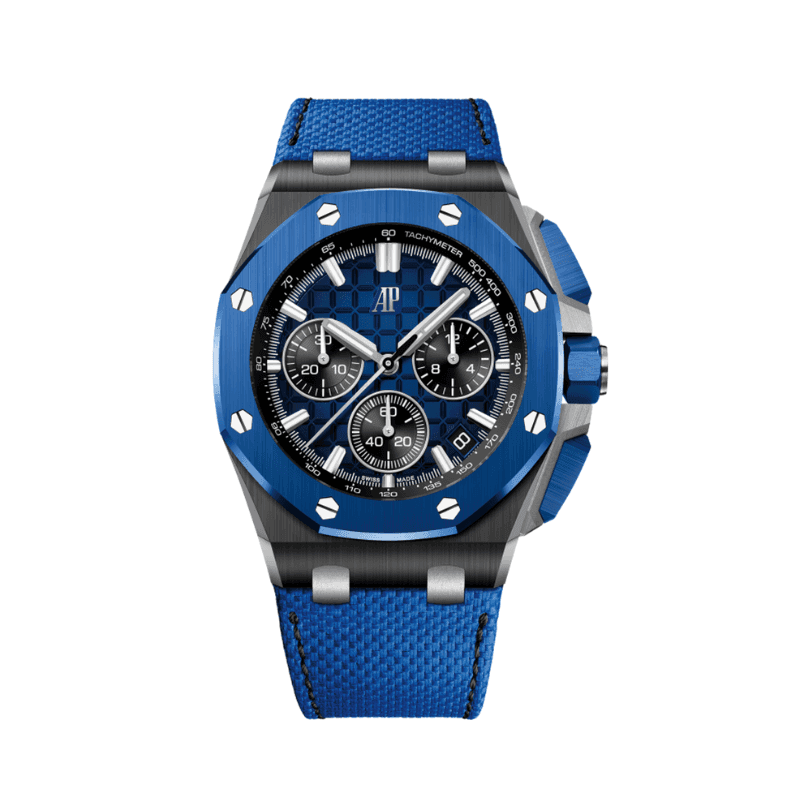 The Audemars Piguet Royal Oak Offshore Chronograph 26480TI.OO.A027CA.01 is a robust and sporty timepiece that combines lightweight materials with a bold design. Crafted from titanium, the 42mm case features the signature Offshore octagonal bezel with a blend of satin-brushed and polished finishes, ensuring both durability and sophistication. The vibrant blue Méga Tapisserie dial offers a striking visual contrast, accented by silvered chronograph subdials and red detailing on the hands and inner