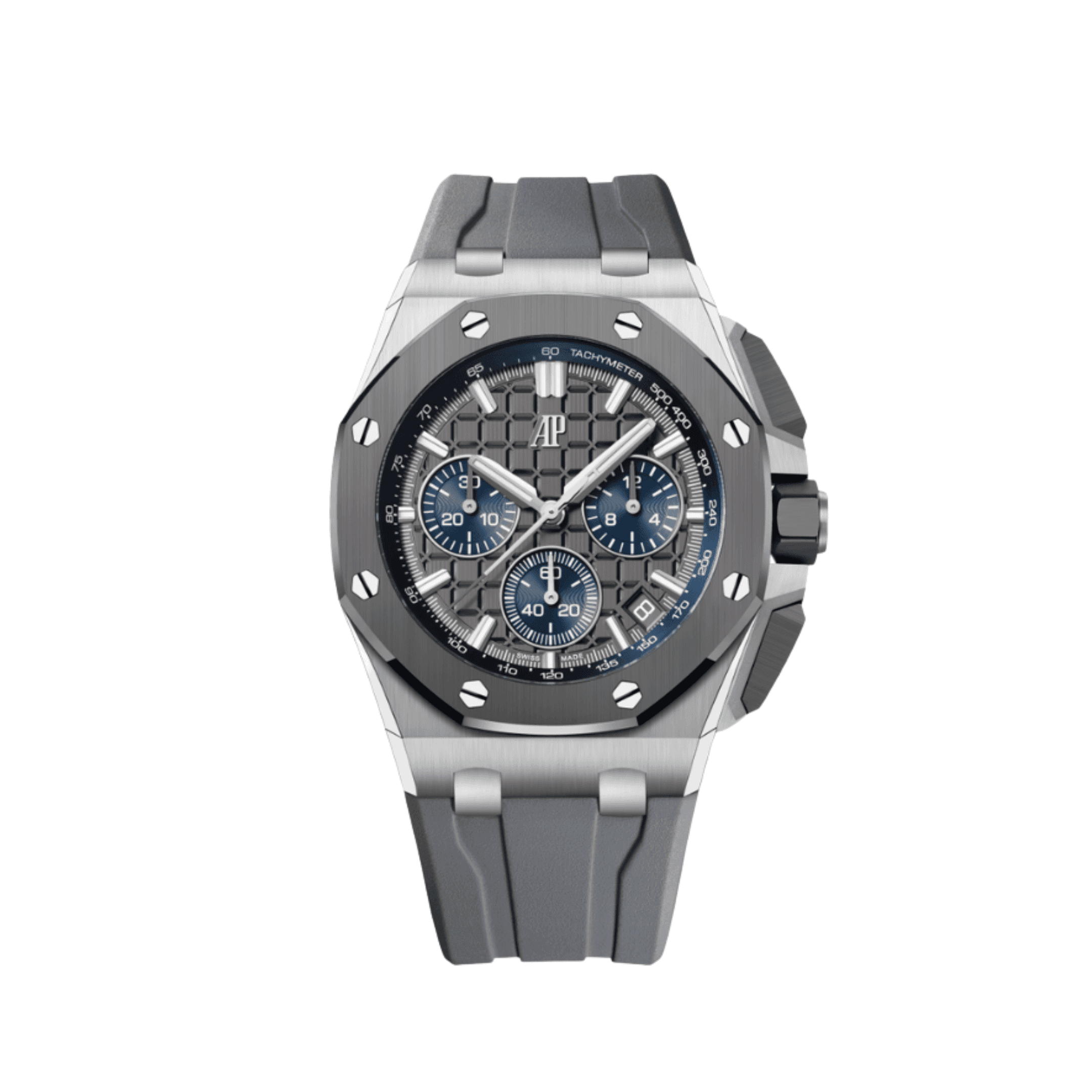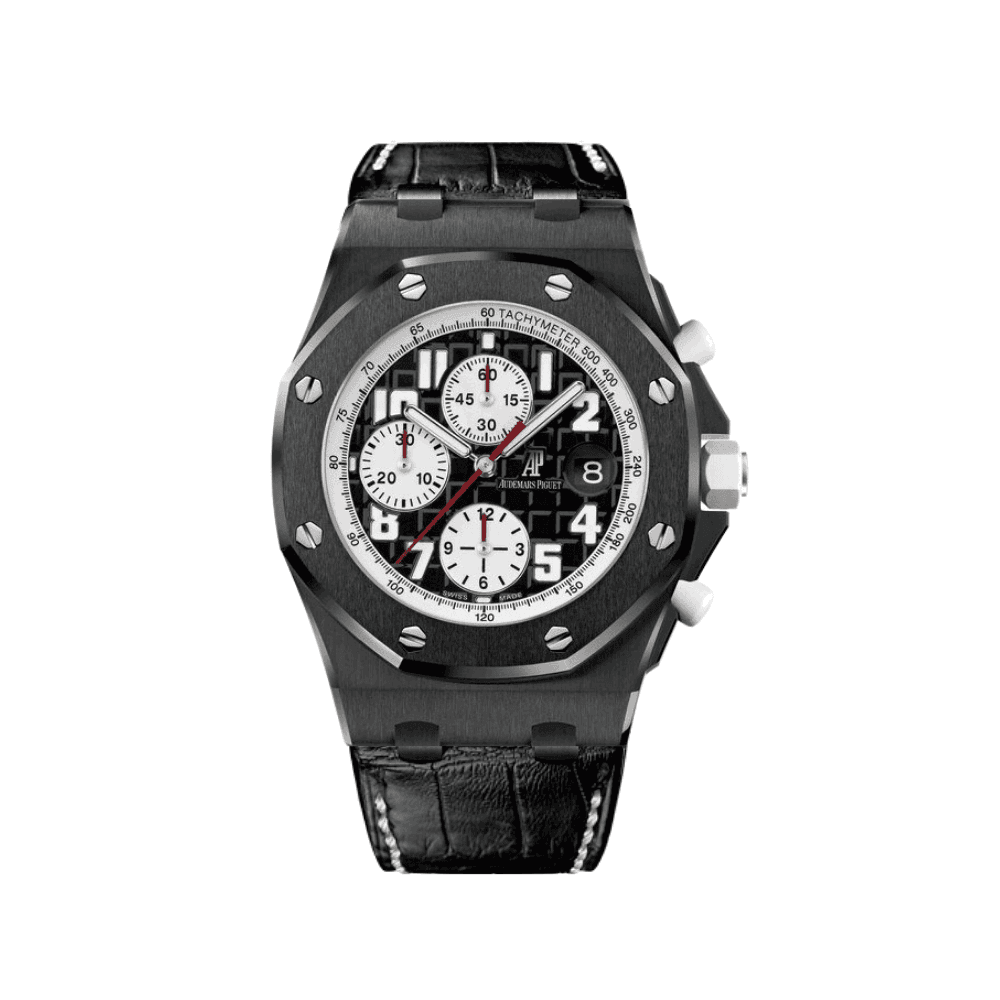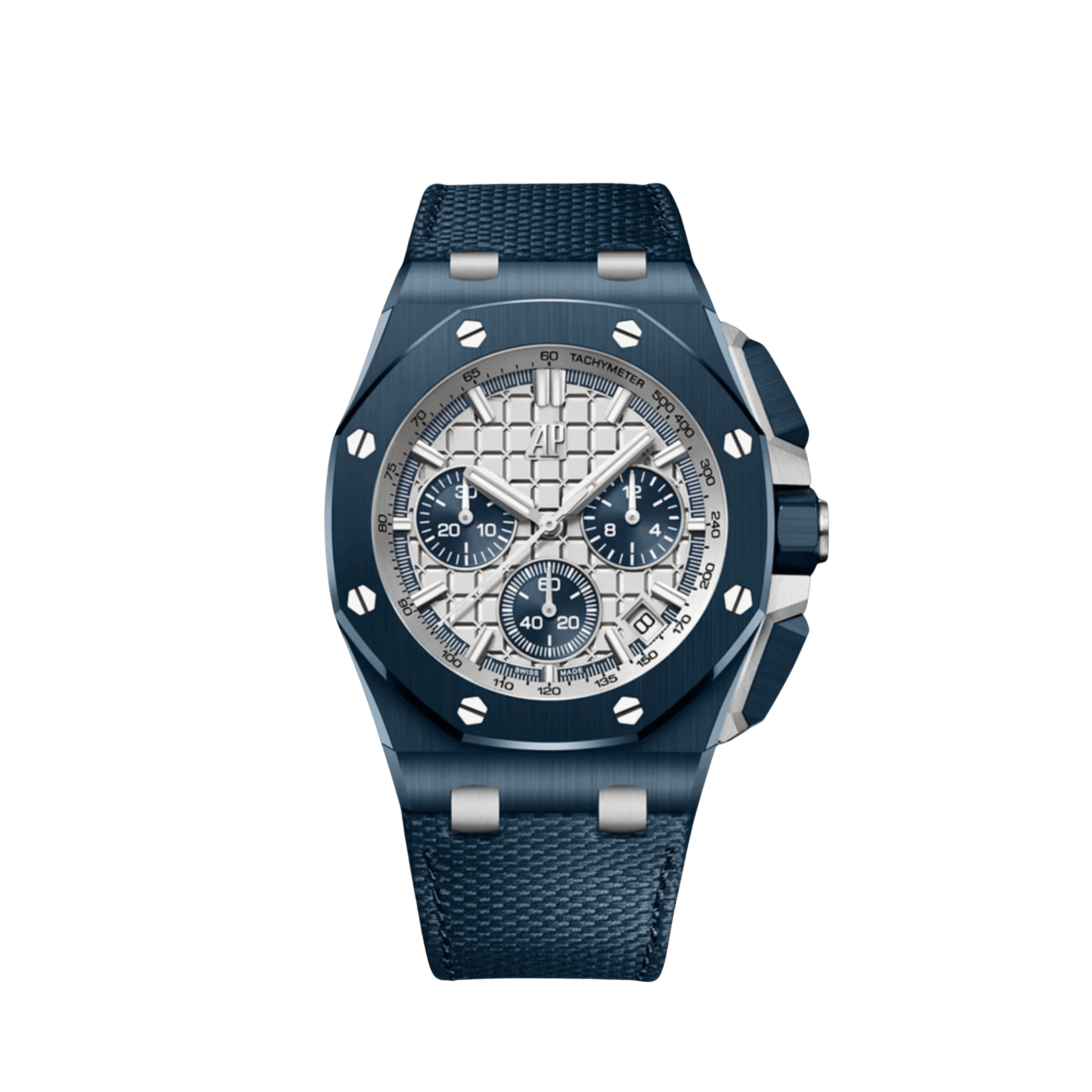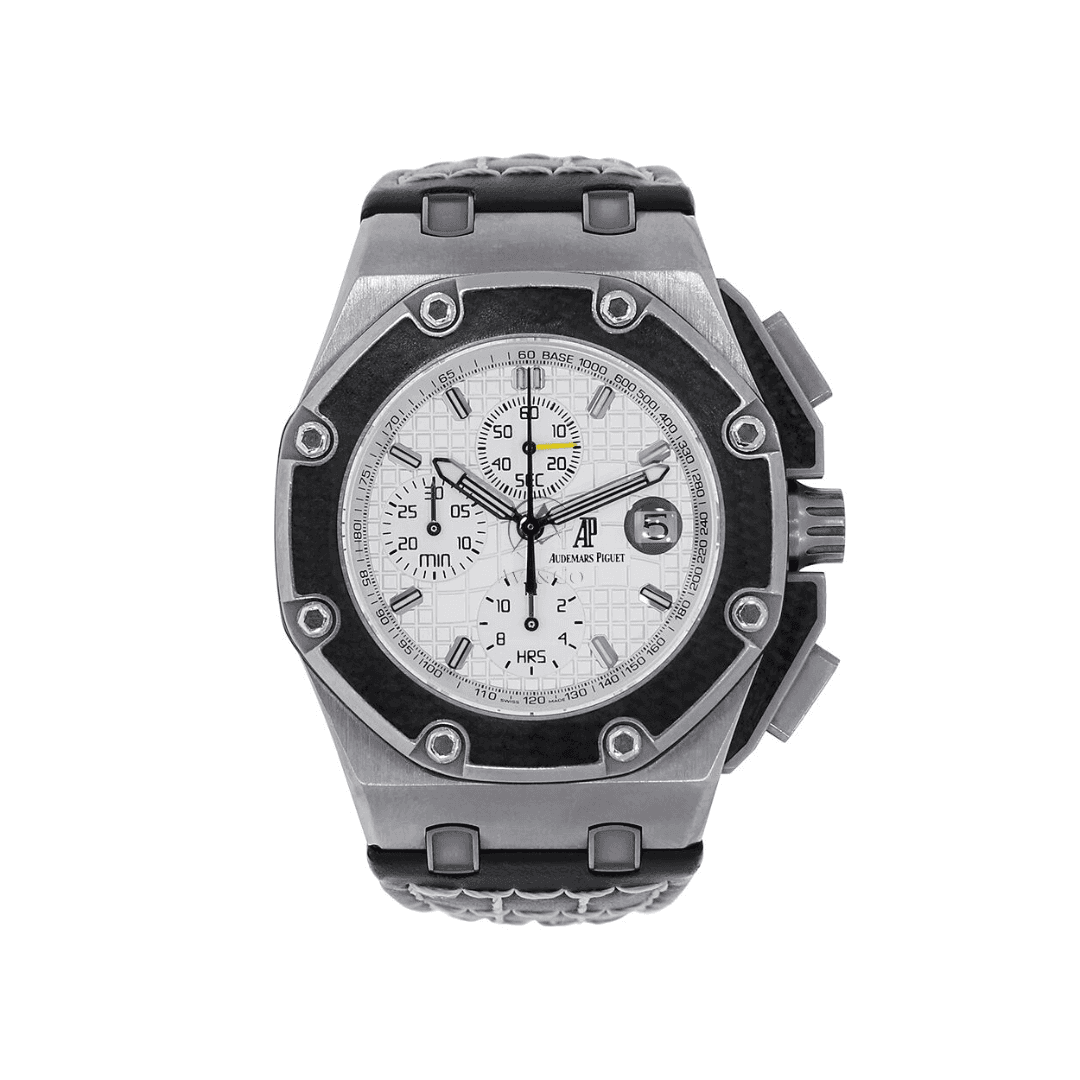 The Audemars Piguet Royal Oak Offshore Chronograph 26480TI.OO.A027CA.01 is a robust and sporty timepiece that combines lightweight materials with a bold design. Crafted from titanium, the 42mm case features the signature Offshore octagonal bezel with a blend of satin-brushed and polished finishes, ensuring both durability and sophistication. The vibrant blue Méga Tapisserie dial offers a striking visual contrast, accented by silvered chronograph subdials and red detailing on the hands and inner